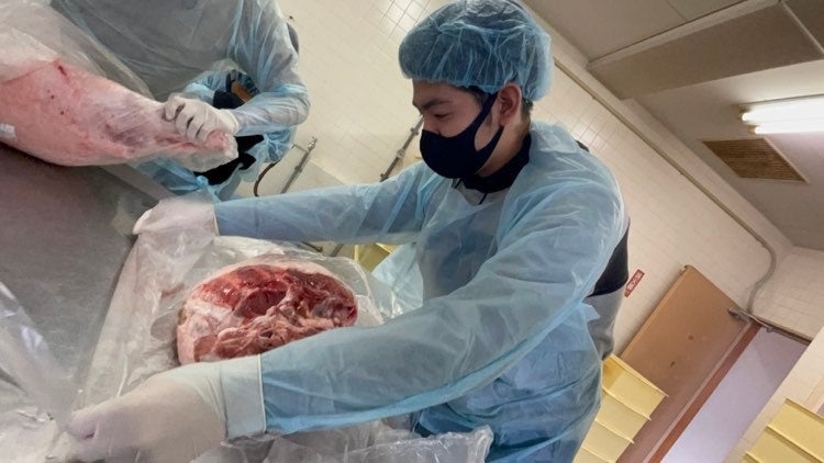仕込み会の様子。1本10キロ前後の豚肉を丁寧に仕込んでいく。